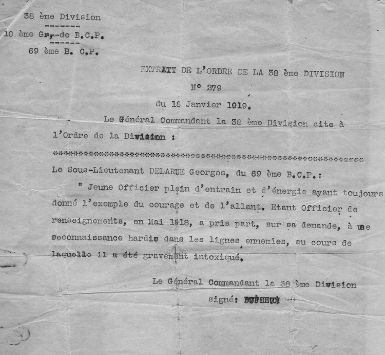 Le Lt Georges DELARUE fut porté disparu dans la nuit du 26 au 27 juin 1918 à Bures en Meurthe et Moselle lors d'une mission de reconnaissance pour laquelle il s'était porté volontaire.
