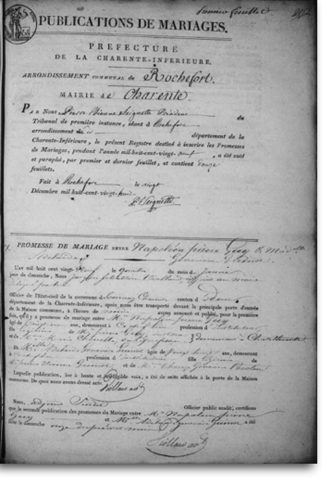 Promesse de mariage de Napoléon Pierre Guy agé de 23 ans, avec Adelaide Geneviève Guinot agée de 28 ans.