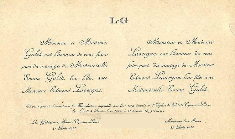 Edmond et Emma se marièrent le 4 septembre 1922 et vécurent à Tours,