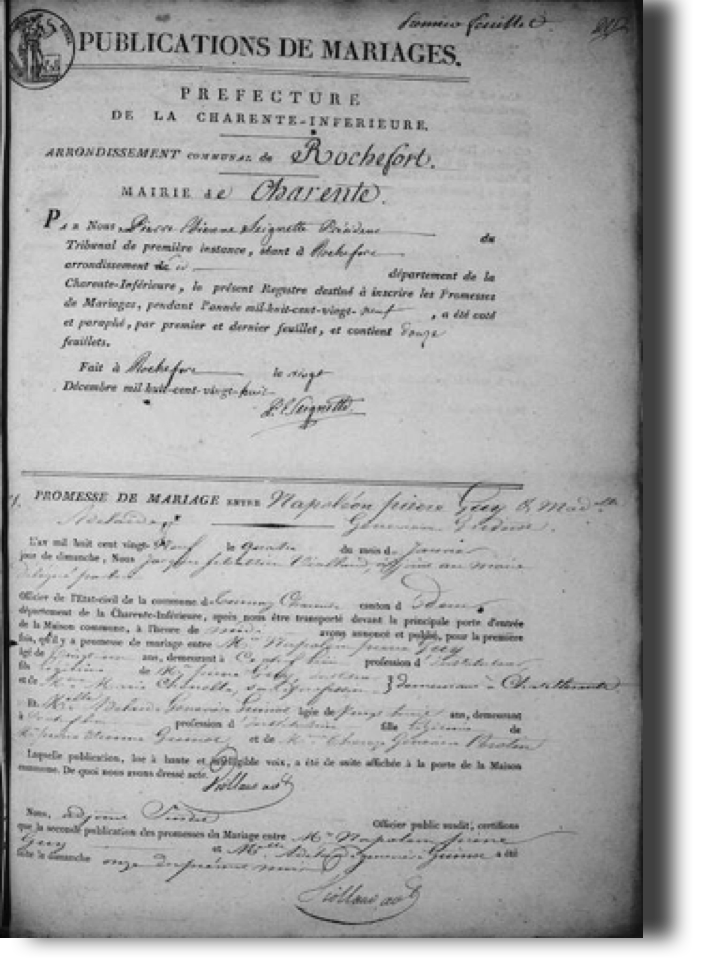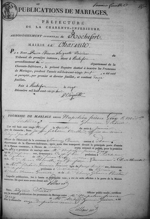 Promesse de mariage de  Napoléon Pierre Guy agé de 23 ans, avec Adelaide Geneviève Guinot agée de 28 ans.